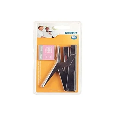 Ergonomically designed stapling pliers for stapling up to 15 sheets (80 gsm paper), Ideal for use at home, at school, in the office or at florists and in shops Strong metal design with a plastic ABS top cover, Automatic staple feeder return action for easy loading Compatible with Rapid Bébé 8/4mm staples, Includes 1000 BEBE staples, Re-load staples easily with the top-loading refill mechanism Features a 50mm insertion depth for flexible stapling, Covered by a 2 year guarantee when using Rapid staples Contents: 1 x Rapid E84 Economy Stapling Pliers, 1000 x BEBE Staples, Metal and Plastic, Silver/Black, Dimensions (WxHxD): 178 x 21 x 236mm, Weight: 370g, 21310301