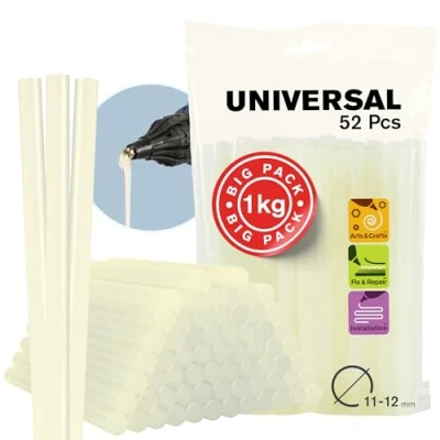 Universal glue sticks diameter 12 mm for hot glue guns are transparent and ideal for crafts, decorating, fixing and repairing; the large packaging contains 1 kg sticks with a length of 190 mm for versatile applications Ideal for wood, paper, cardboard, metal, textile, leather, cork, ceramic, glass and plastic (except soft PVC, PE, PP, PTFE, polystyrene); provides almost invisible connections and can be easily removed with hot air Compatible with various hot glue guns such as Rapid 12 mm models EG111, EG212, EG250, CG270, EG280, BGX300 and EG310 as well as standard 11 mm glue guns such as Steinel and Pattex The quick adhesive lasts in seconds and reaches maximum force in 2 minutes; solvent free, non-toxic, does not drip, high strength and resilience, clean handling Box contents: 1 kg Rapid glue sticks, diameter 12 mm, length 190 mm, 50 sticks, transparent, in plastic bag, ECO-T, item number 40302798