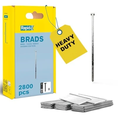 Galvanised No.8 brad nails, 50 mm wire length, for professional and trade users, ideal for joinery, carpentry, skirting, moulding, beading and frames, delicate wood and thin trim pieces, designed for discreet and invisible applications Optimal for outdoor use thanks to galvanised steel construction, 2 x 1.25 x 50 mm size, easy numerical system for easy selection and purchasing, fits Rapid PB131, PBS151 and BN50 tools For fastening materials such as pieces of wood in carpentry, crown moulding in joinery and all kinds of finishing applications, optimal penetration thanks to precision cut legs No rusting thanks to High performance galvanised steel wire material, leaves 1 mm holes if removed Contents: One pack (2800 pieces) Rapid No.8 brad nails, 2 x 1.25 x 50 mm size, high performance, galvanised steel, 5000186, W x H x D: 7.3 x 3.7 x 13.2 cm, weight: 1.2 kg, Weight: 2.314853751 Pounds, Manufacturer: Isaberg Rapid