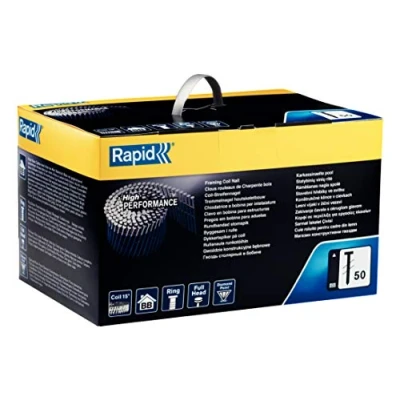 Industrial 15° coil framing nails have a bright basic finish for indoor use, Ideal for framing, sheathing, decking, sub-flooring and working with crates, pallets or box assembly 65 mm leg length, Ring shank for best holding strength, Diamond point for best possible penetration into the material, For use with the Rapid PCN90 Full head Ø5.8 mm, Wire diameter: 2.5 mm, 15° coil, Metal wire collation - 225 nails per coil, Packed in a handy box with carry handle Complies with Construction products regulation (EU) 305/2011. Service Class 1 Nails, CE approved, Declared performances according to DIN EN14592. Contents: 2700 x No. 50 Nails, 65mm Length, Indoor Use, Dimensions (WxDxH) 20.5 x 23.3 x 35cm, Weight 7.644, 5000808, Weight: 16.85213530728 pounds, Manufacturer: Isaberg Rapid