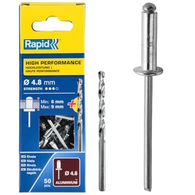 General description High-performance aluminum rivets designed for fixing materials in exposed areas such as mudguards, metal and plastic panels, signs, and plaques. They are suitable for outdoor and demanding applications, providing strong and durable fastening. Technical specifications Size: 4.8 x 12 mm Grip range: 6-9 mm Material: Aluminum with steel mandrel Quantity: 50 rivets per blister Protection rating: IP20 Warranty: 2 years MPN: 5000388 EAN: 4051661013485 Compatibility and accessories Compatible with Rapid models RP10, RP40, RP60, RP100 Includes a drill bit suitable for installation Installation Use a compatible drill to insert the rivets into pre-drilled holes Ensure the rivet head is flush with the surface for a secure fit Usage Ideal for fixing panels, signs, and metal or plastic components in exposed environments Suitable for outdoor applications requiring durable fastening Perfect for use on license plates, mudguards, metal and plastic coverings, name plates, metal
