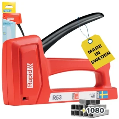 LIGHTWEIGHT DIY STAPLE GUN - The Rapid R53 Staple Gun is a lightweight and robust staple gun, perfect for home DIY projects and simpler professional jobs ERGONOMIC AND CONVENIENT - The R53's ergonomic handle ensures comfortable use during demanding upholstery and textile jobs, perfect for smaller hands MADE IN SWEDEN - Crafted in Sweden, this product is designed to last, featuring durable, impact-resistant ABS plastic and superior-quality steel in its internal mechanisms FINE WIRE STAPLES - Uses Rapid No.53 4-10 mm staples, we recommend using Rapid original staples with your Rapid tools to achieve the best results CONTENTS: 1 x Rapid R53 Manual Staple Gun, plus starter pack of No.53 6 mm staples (1080 pcs), WxHxD: 117 x 32 x 180 mm, weight: 274 g, 3-year guarantee, made in Sweden (5001747), Manufacturer: Isaberg Rapid AB