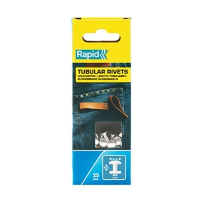 General description These Rapid tubular rivets are designed for use with textiles and leather, measuring 3 x 8 x 9 mm. They are perfect for customizing jeans, repairing pockets or belts, and other fastening applications on fabric or leather surfaces. The pack includes 25 rivets with a head size of 8 x 3 mm, along with an installation tool for easy application. Technical specifications Material: Steel Size: 3 x 8 x 9 mm Head size: 8 x 3 mm Quantity: 25 rivets per pack Type: Tubular rivets Installation Use the included installation tool to attach the rivets securely. Ensure the rivets are aligned properly before pressing. Punch a hole with the Rapid RP03 pliers, then bring the two parts of the tubular rivets together and fix with a small hammer. Usage Ideal for customizing clothing, repairing damaged pockets, or attaching accessories to fabric or leather. Suitable for DIY projects and professional repairs. Other information