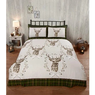 Add a sense of nature to your bedroom with this Stag themed design. This design features a country Angus stag head print in a green colourway on the front with a checked border on the edges of the duvet cover and pillow cases, with the reverse feauturing a classic green fully checked print. Material - 100% Brushed Cotton. Care Instructions - Machine washable at 40°c and tumble dry. Contents - Double duvet cover (200x200cm) plus 2 matching pillowcases (50x75cm)