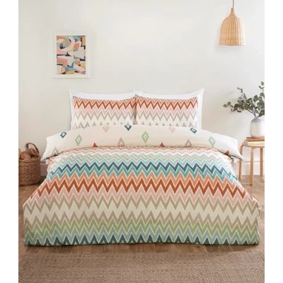 Complete Bedding Set: This set includes one duvet cover (220x230cm), one fitted sheet (152x198cm), and 2 matching pillowcases (50x75cm), providing a coordinated look for your bed. Secure Closure: The duvet cover features a convenient popper closing mechanism, ensuring your duvet stays securely in place throughout the night. High-Quality Material: Crafted from premium microfibre, this bedding set offers exceptional softness and comfort, enhancing your sleeping experience. Reversible Design: Enjoy versatility with a duvet set that offers two distinct looks. Durability and Comfort: The microfibre material is not only comfortable but also durable, promising long-lasting use and a consistently good night's sleep for years to come. Transform your bedroom into a vibrant oasis with our Bali Complete Set featuring a bed adorned with a colorful chevron pattern.