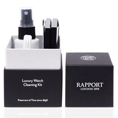 COMPLETE WATCH CARE SET — The Rapport Luxury Watch Care Kit offers everything you need to maintain the pristine look of your valuable timepieces. Designed specifically for luxury and precision watches, it includes a professional-grade cleaning spray, polishing cloths, and a detailing brush, ensuring your watch collection remains spotless and well-maintained. Perfect for everyday maintenance or occasional deep cleaning. GENTLE YET POWERFUL CLEANING SOLUTION — Formulated to remove dirt, oil, sweat, and buildup from daily wear without damaging delicate surfaces, the cleaning solution is safe for use on stainless steel, gold, silver, and leather materials. Its non-abrasive formula gently lifts grime and residue, preserving your watch’s original shine and ensuring long-term durability without affecting protective coatings or finishes. DUAL-ACTION POLISHING CLOTHS FOR SUPERIOR FINISH — Includes both a soft watch polishing cloth and a metal-specific polishing cloth designed to restore brilliance to every part of your watch. The microfiber watch cloth gently buffs away smudges and dust while the metal cloth enhances lustre on gold and steel surfaces, leaving your timepiece streak-free, polished, and gleaming with professional-quality results. PRECISION DETAILING BRUSH FOR DEEP CLEANING — The fine-bristled cleaning brush allows for meticulous cleaning of hard-to-reach areas such as bracelet links, bezels, and crowns. Its ergonomic design ensures comfort and control during use helping you remove stubborn grime and residue without scratching or damaging your watch. Ideal for maintaining intricate parts and mechanical watch designs. ELEGANT, COMPACT & GIFT-READY PACKAGING — All components are neatly housed in a durable compact box that’s easy to store or carry during travel. The set combines function with style, making it an excellent choice for collectors, professionals, or anyone who values fine craftsmanship. It is neatly packed in a durable box for convenient storage and portability. Size: 12cm (L) × 7.5cm (W) × 7.5cm (H)