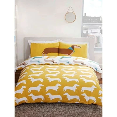 ADORABLE DACHSHUND DESIGN: Brighten up any bedroom with our charming ochre sausage dog pattern, perfect for pet lovers, kids, and teens. Features a playful, eye-catching print that adds character and warmth to your decor. REVERSIBLE & VERSATILE: Enjoy two looks in one with this fully reversible duvet cover set. Easily switch up your style to refresh your room's aesthetic, offering flexibility and extended decorative appeal. COMFORTABLE POLYCOTTON BLEND: Crafted from a soft and durable 50% Polyester, 50% Cotton blend, this bedding set offers a comfortable sleep experience. It's designed for everyday use, providing a cozy touch. EASY CARE & MACHINE WASHABLE: Maintain pristine bedding effortlessly. This Double duvet cover set is machine washable at 30°C, ensuring convenient cleaning and lasting vibrancy without complex care routines. COMPLETE Double BED SET: Includes one Double duvet cover (200x200cm) and two matching pillowcases (50 x 75 cm), perfectly sized for standard UK Double beds. Transform your space with a coordinated and delightful look.