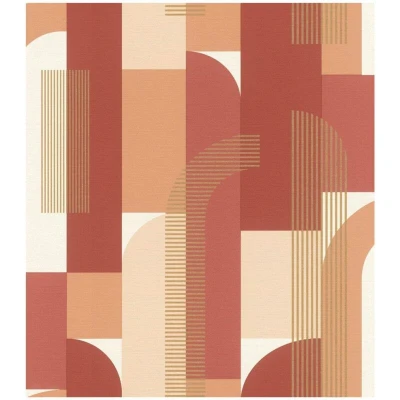 This strikingly contemporary wallpaper design display a sophisticated retro charm, perfect for creating a bold and artistic statement in any modern interior. The pattern features a dynamic interplay of overlapping geometric shapes, including large rectangles, elegant curved arcs, and slender vertical lines, all rendered in a compelling palette of warm, earthy tones. Deep terracotta red and warm burnt orange dominate the larger blocks, providing a grounding and inviting presence, while softer peach and subtle off-white hues offer refreshing contrast and visual balance. Adding a touch of understated luxury, fine vertical stripes in a muted gold or brass tone punctuate certain sections, catching the light and enhancing the modern art-deco sensibility of the design. This wallpaper creates a sense of movement and depth, making walls come alive with its architectural yet organic forms. Its distinctive aesthetic is ideal for enhancing a feature wall in a living room, adding character to a