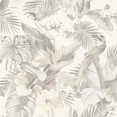 A heavy weight vinyl wallcovering with a fabulous texutred jungle all over design with exotic flowers and birds of paradise - created with lustre inks. Shown in the neutral cream and light grey colourway.