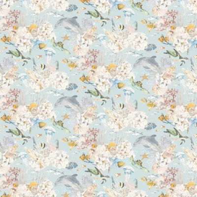 A bright and bustling coral reef design, filled with your favourite underwater friends, bringing this design to life!Seen here in the Blue Multi colourway. Search: Starfish, Turtle, Seahorse.