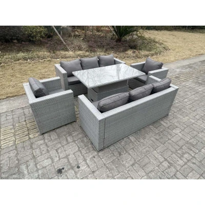 General description This Fimous Rattan Garden Furniture Set includes an adjustable rising table and a lounge sofa with two armchairs, designed for both dining and relaxation. The set features a light grey mixed rattan finish complemented by dark grey fabric cushions, providing a stylish addition to your outdoor space. Technical specifications Set Dimensions: 2 x Three Seater Sofa: 177W x 65D x 66H cm 1 x Adjustable Table: 140L x 80W x 68/48H cm (height adjustable from 68 cm to 48 cm) 2 x Chairs: 74L x 65W x 66H cm Material: Flat PE Rattan, 5mm thickness transparent tempered glass Cushion Thickness: 8 cm Installation Items come flat packed for easy assembly. Sturdy galvanized steel tube metal frames with powder coating to prevent rust. Usage Table can be used as both a coffee and dining table. Removable cushion covers for low maintenance. Keep cushions indoors or use a rain cover when not in use. Use a rain cover to protect the furniture if not used for a long time. Other information