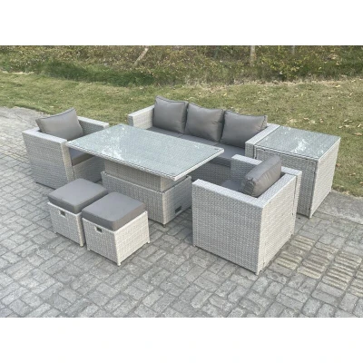 General description This Fimous Rattan Garden Furniture Set includes an adjustable rising table, a three-seater sofa, two armchairs, a side coffee table, and two fully assembled stools. The set is designed for both dining and coffee use, featuring a light grey mixed rattan with dark grey fabric. Please note that color may vary slightly due to lighting or monitor settings. Technical specifications Three Seater Sofa: 177W x 65D x 66H cm Adjustable Table: 140L x 80W x 68/48H cm (height adjustable from 68 cm to 48 cm) Chairs: 74L x 65W x 66H cm Side Coffee Table: 65L x 65W x 66H cm Stools: 40L x 40W x 34H cm Material: Flat PE rattan with 5mm thickness transparent tempered glass Cushion Thickness: 8 cm with soft pillow back cushion Installation The furniture comes flat packed and is easy to assemble. It features sturdy galvanized steel tube metal frames with powder coating to prevent rust. Usage This versatile furniture set can be used for both dining and coffee purposes. It is low