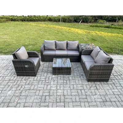 General description This 5-piece deluxe garden furniture set enhances the aesthetic of your courtyard, deck, backyard, porch, or swimming pool. Constructed from high-quality PE rattan and durable galvanized steel, it is designed to withstand adverse weather conditions in the UK. The set can be easily reconfigured to suit your needs at any time. Technical specifications 1 x Side Coffee Table: 65L x 65W x 66H cm 1 x Reclining Chair: 74L x 67W x 79H cm 1 x Loveseat Sofa: 124W x 67D x 79H cm 1 x 3-Seater Sofa: 177W x 67D x 79H cm 1 x Square Coffee Table: 65L x 65W x 34H cm Seat Cushion Thickness: 8 cm Material: Dark grey mixed rattan with dark grey fabric Installation Items come flat packed and are easy to assemble. The sturdy galvanized steel tube frames are powder-coated to prevent rust. Usage The reclining chairs are adjustable, allowing you to change the backrest inclination from 90° to 130° using a button. For maintenance, keep the cushions indoors or use a rain cover when not in
