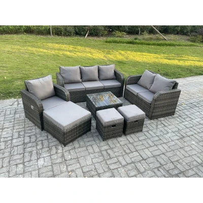 General description This 7-piece deluxe garden furniture set enhances the beauty of your courtyard, deck, backyard, porch, or swimming pool. Constructed from high-quality PE rattan and durable galvanized steel, it is designed to withstand adverse weather conditions. The set can be easily reconfigured to suit your needs at any time. Technical specifications 1 x Big footstool: 65L x 65W x 34H cm 2 x Fully assembled small footstools: 40L x 40W x 34H cm 1 x Reclining chair: 74L x 67W x 79H cm 1 x Love seat sofa: 124W x 67D x 79H cm 1 x 3-seater sofa: 177W x 67D x 79H cm 1 x Square coffee table: 65L x 65W x 34H cm Color: Dark grey mixed rattan with dark grey fabric Seat cushion thickness: 8 cm Installation Items come flat packed and are easy to assemble. The sturdy galvanized steel tube frames are powder-coated to prevent rust. Usage The armchair features an adjustable backrest that can be inclined from 90° to 130° using a button. For maintenance, keep the cushions indoors or use a rain