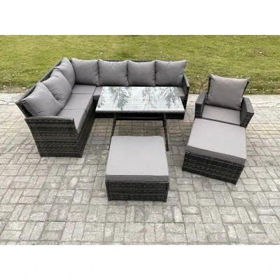 Rattan Garden Furniture Corner Sofa Set with Oblong Dining Table 2 Big Footstool Armchair Outdoor Wicker Dark Grey Mixed Fimous