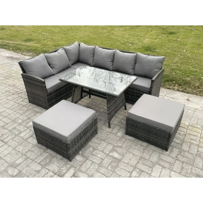 Rattan Garden Furniture Corner Sofa Set with Oblong Dining Table 2 Big Footstool Outdoor Wicker Dark Grey Mixed Fimous