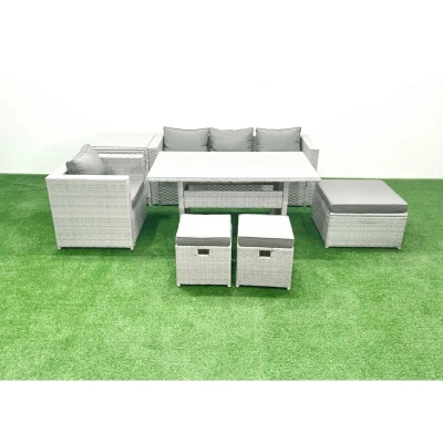 Rattan Garden Furniture Dining Set 7 Seater Lounge Sofa Chair Table with 3 Footstools Side Light Grey Mixed Fimous