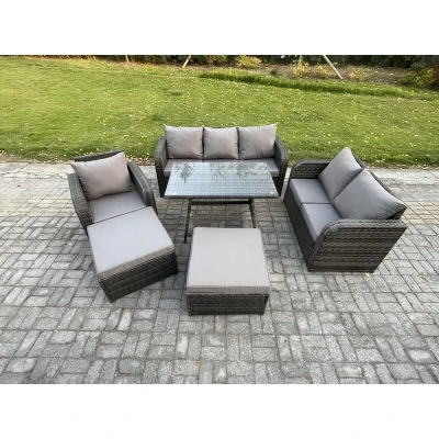 General description This outdoor garden furniture sofa set provides ample seating for 8 people, featuring a tempered glass dining table ideal for holding food, drinks, and more. It is a perfect addition to your patio, garden, backyard, pool, and other indoor and outdoor spaces. Technical specifications 1 x Reclining Chair: 74W x 67D x 79H cm 2 x Big Footstools: 65L x 65W x 34H cm 1 x 3 Seater Sofa: 177W x 67D x 79H cm 1 x Love Sofa: 124W x 67D x 79H cm 1 x Rectangular Dining Table: 110L x 70W x 70H cm Material: Dark grey mixed rattan with dark grey fabric Seat Cushion Thickness: 8 cm Installation Items come flat packed and are easy to assemble. The furniture features sturdy galvanized steel tube metal frames with powder coating to prevent rust. Usage The armchairs are adjustable, allowing you to change the inclination of the chair back from 90° to 130° using a button. The cushions are removable for low maintenance, and it is recommended to keep the cushions indoors or use a rain cover