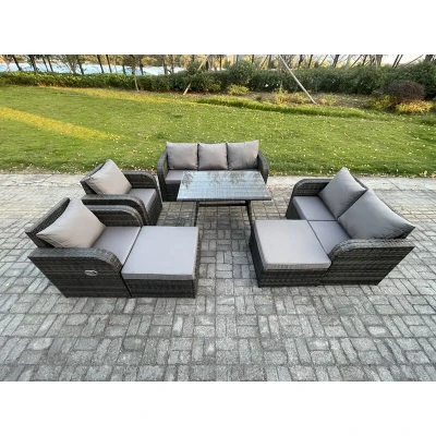 General description This outdoor garden furniture sofa set provides ample seating for 9 people, featuring a tempered glass dining table ideal for holding food, drinks, and more. It is a perfect addition to your patio, garden, backyard, pool, and other indoor and outdoor spaces. Technical specifications 2 x Reclining Chairs: 74W x 67D x 79H cm 2 x Big Footstools: 65L x 65W x 34H cm 1 x 3 Seater Sofa: 177W x 67D x 79H cm 1 x Love Sofa: 124W x 67D x 79H cm 1 x Rectangular Dining Table: 110L x 70W x 70H cm Material: Dark grey mixed rattan with dark grey fabric Seat Cushion Thickness: 8 cm Installation Items come flat packed and are easy to assemble. Usage The armchairs are adjustable, allowing you to change the inclination of the chair back from 90° to 130°. Keep the cushions indoors or use a rain cover when not in use. Use a rain cover to protect the furniture if not used for an extended period. Other information Sturdy galvanized steel tube metal frames with powder coating to prevent