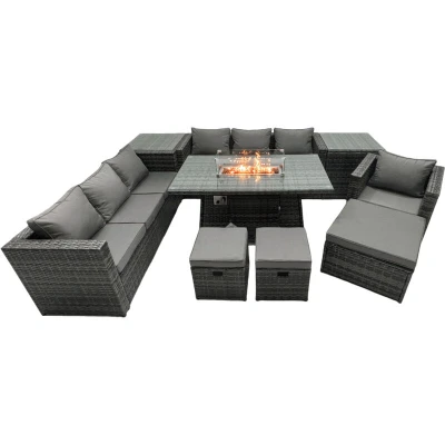 General description This Fimous Rattan Garden Furniture Firepit Dining Set is designed for outdoor relaxation and entertainment, accommodating up to 10 people. The set includes two 3-seater sofas, an armchair, two side tables, a large footstool, and a fire pit dining table, all crafted from durable materials for long-lasting use. Technical specifications Set dimensions: 2 x 3 Seater Sofa: 177W x 65D x 66H cm 1 x Armchair: 74L x 65W x 66H cm 2 x Side Tables: 65L x 65W x 66H cm 1 x Big Footstool: 65L x 65W x 34H cm 2 x Fully Assembled Stools: 40W x 40D x 34H cm 1 x Fire Pit Dining Table: 140L x 80W x 70H cm Material: Dark grey mixed rattan with dark grey fabric 5mm thick transparent tempered glass with suckers on the surface to prevent sliding 8 cm thick seat cushion with soft back cushion for added comfort Installation Items come flat packed and are easy to assemble. Sturdy galvanized steel tube metal frames with powder coating to prevent rust. Usage Place the gas fire pit on the glass