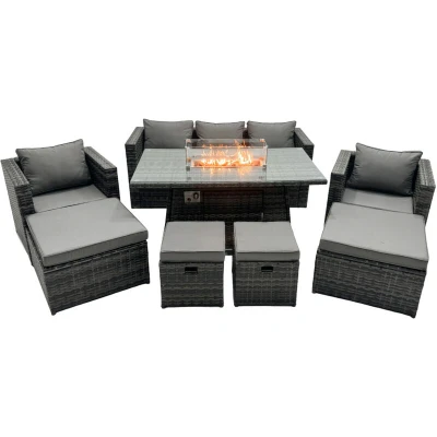 General description This Fimous Rattan Garden Furniture Firepit Dining Set is a stylish and functional 9-seater lounge sofa table set, perfect for outdoor gatherings. It includes a fire pit dining table and two large footstools, providing both comfort and elegance to your garden or patio. Technical specifications 1 x 3 Seater Sofa: 177W x 65D x 66H cm 2 x Arm Chairs: 74L x 65W x 66H cm 2 x Big Footstools: 65L x 65W x 34H cm 2 x Fully Assembled Stools: 40W x 40D x 34H cm 1 x Fire Pit Dining Table: 140L x 80W x 70H cm Material: Dark grey mixed rattan with dark grey fabric Seat Cushion Thickness: 8 cm Glass Top Thickness: 5 mm tempered glass Installation Items come flat packed and are easy to assemble. Sturdy galvanized steel tube metal frames with powder coating to prevent rust. Usage Place the gas fire pit on the glass top, not under it. Do not cover the igniter with lava rocks. Check for any gas leaks at the joints or hose before use. Recommended to use a 5 kg gas tank. Other
