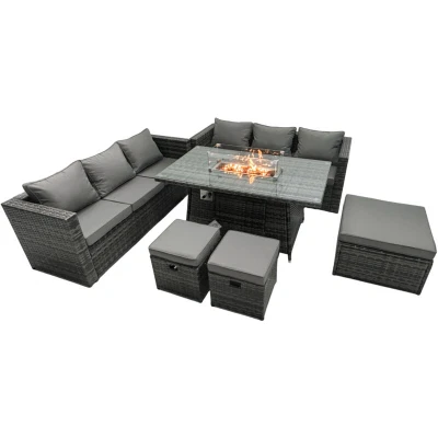 Rattan Garden Furniture Firepit Dining Set 9 Seater Lounge Sofa Table with 3 Footstool Fimous