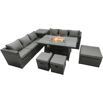 Rattan Garden Furniture Firepit Dining Set 9 Seater Lounge Sofa Table with Side 3 Footstool Fimous