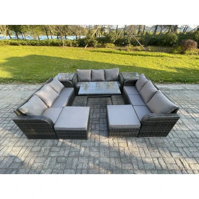 General description This 11 Seater Modern deluxe rattan garden furniture set is perfect for various occasions. It features a strong and durable design, ensuring longevity, and includes a tempered glass tabletop. The set comes with cushions tailored to the shape of the sofa and chairs for added comfort, making it an excellent choice for enhancing any garden, patio, or conservatory. Technical specifications Set Dimensions: 2 x Side coffee table: 65L x 65W x 66H cm 2 x Big footstool: 65L x 65W x 34H cm 3 x 3 Seater Sofa: 177W x 67D x 79H cm 1 x Rectangular Dining Table: 110L x 70W x 70H cm Material: Dark grey mixed rattan with dark grey fabric Thickness of tempered glass: 5mm Cushion thickness: 8 cm Installation Items come flat packed and are easy to assemble. Sturdy galvanized steel tube metal frames with powder coating to prevent rust. Usage Low maintenance required. Cushion covers are removable for easy cleaning. It is recommended to keep cushions indoors or use a rain cover when not