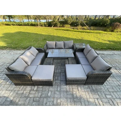 Rattan Garden Furniture Set 11 Seater Patio Outdoor Lounge Sofa with Side Table Rectangular Dining 2 Big Footstool Dark Grey Mixed Fimous