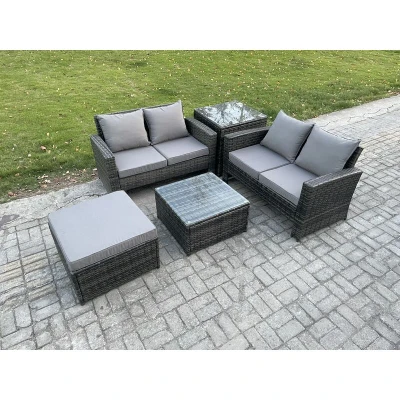 General description This Fimous Rattan Garden Furniture Set is a stylish and functional addition to your patio or garden. Made from high-quality PE rattan and durable galvanized steel, this outdoor furniture set is designed for sturdiness and longevity, allowing it to withstand outdoor conditions year-round. Technical specifications Set includes: 2 Double Seat Sofas, 1 Coffee Table, 1 Big Footstool, 1 Side Table Side Coffee Table dimensions: 65L x 65W x 66H cm Square Coffee Table dimensions: 65L x 65W x 34H cm Big Footstool dimensions: 65L x 65W x 34H cm 2 Seater Sofa dimensions: 124L x 70W x 74H cm Color: Dark grey mixed rattan with dark grey fabric Cushion thickness: 8 cm Installation Items come flat packed for easy assembly Includes sturdy galvanized steel tube frames with powder coating to prevent rust 5mm thick transparent tempered glass with suckers on the surface to prevent sliding Usage Low maintenance with removable cushion covers Recommended to keep cushions indoors or use a