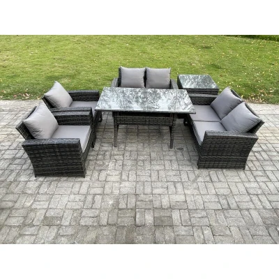 Rattan Garden Furniture Set 6 Seater Patio Outdoor Lounge Sofa with Oblong Dining Table Double Seat Side Dark Grey Mixed Fimous
