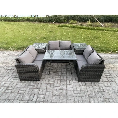 Rattan Garden Furniture Set 6 Seater Patio Outdoor Love Sofa with Rectangular Dining Table 2 Side Tables Dark Grey Mixed Fimous
