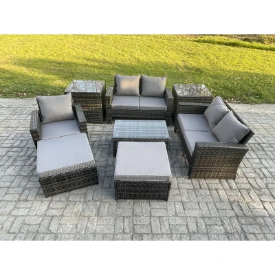 Rattan Garden Furniture Set 7 Seater Patio Outdoor Lounge Sofa Chair with Rectangular Coffee Table 2 Big Footstool Side Tables Dark Grey Mixed