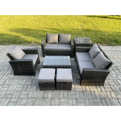 Rattan Garden Furniture Set 7 Seater Patio Outdoor Lounge Sofa Chair with Side Table Rectangular Coffee 2 Small Footstools Dark Grey Mixed