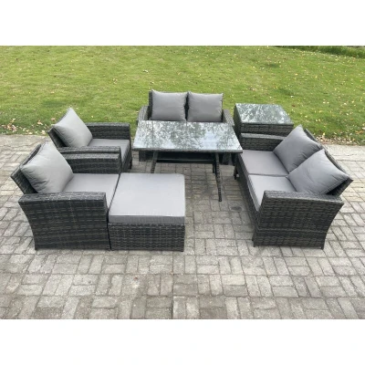 Rattan Garden Furniture Set 7 Seater Patio Outdoor Lounge Sofa with Rectangular Dining Table Love Seat Side Big Footstool Dark Grey