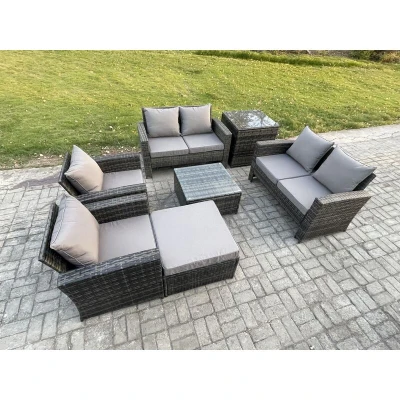 Rattan Garden Furniture Set 7 Seater Patio Outdoor Lounge Sofa with Square Coffee Table Double Seat Side Big Footstool Dark Grey Mixed