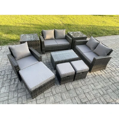 Rattan Garden Furniture Set 8 Seater Patio Outdoor Lounge Sofa Chair with Rectangular Coffee Table 3 Footstools 2 Side Tables Dark Grey Mixed