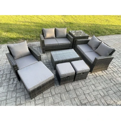 Rattan Garden Furniture Set 8 Seater Patio Outdoor Lounge Sofa Chair with Rectangular Coffee Table 3 Footstools Side Dark Grey Mixed