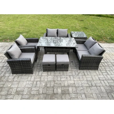 Rattan Garden Furniture Set 8 Seater Patio Outdoor Lounge Sofa with Oblong Dining Table Double Seat Side 2 Small Footstools Dark Grey