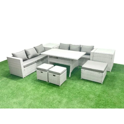 Rattan Garden Furniture Set 9 Seater Outdoor Sofa with Dining Table 2 Side Tables 3 Footstools Light Grey Mixed Fimous