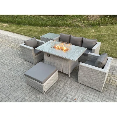 General description This Fimous Rattan Garden Furniture Set includes a gas fire pit, lounge sofa, dining set with a side table, and two armchair footstools. It features a stylish light grey mixed rattan design complemented by dark grey fabric cushions, providing both comfort and elegance for your outdoor space. Technical specifications Three Seater Sofa: 177W x 65D x 66H cm Fire Pit Table: 140L x 80W x 69H cm Chairs (2): 74L x 65W x 66H cm Side Table: 65L x 65W x 66H cm Footstool: 65L x 65W x 34H cm Material: Handcrafted PE rattan with galvanized steel tube frames Glass Top: 5mm thick transparent tempered glass Cushion Thickness: 8 cm Installation The furniture set comes flat packed and is easy to assemble. Ensure to follow the assembly instructions provided in the package. Usage For optimal safety and performance, please adhere to the following guidelines: Place the gas fire pit on the glass top, not underneath it. Do not cover the igniter with lava rocks. Check for any gas leaks at
