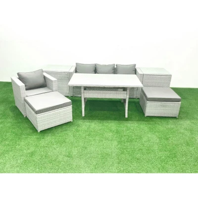 Rattan Garden Furniture Set Outdoor 6 Seater Patio Dining Sets with Glass Top Table 2 Side Tables Light Grey Mixed Fimous