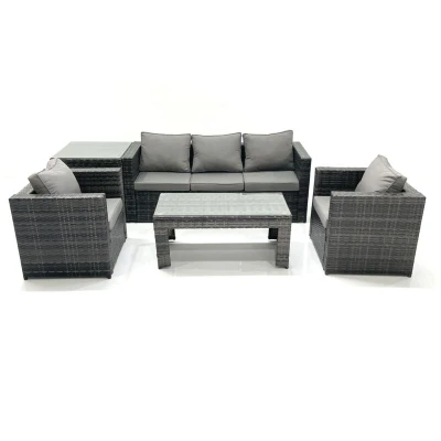 General description This wicker rattan lounge sofa set is suitable for both indoor and outdoor use, featuring high-quality PE rattan and a durable galvanized steel construction for sturdiness and longevity. The design combines country chic with modern minimalism, adding an elegant touch to your space. It can be placed on patios, balconies, or gardens. Technical specifications Double armrest sofa size: 176W x 65D x 66H cm Chair size: 74W x 65D x 66H cm (2 chairs) Side table size: 65W x 65D x 66H cm Oblong coffee table size: 105L x 50W x 48H cm Sofa weight capacity: 250 kg Color: Dark grey mixed PE rattan Thickness of tempered glass: 5 mm Seat cushion thickness: 8 cm Installation Items come flat packed and are easy to assemble. Sturdy galvanized steel tube metal frames with powder coating to prevent rust. Usage Low maintenance with removable cushion covers. Keep cushions indoors or use a rain cover when not in use. Use a rain cover for the furniture if not in use for an extended period.
