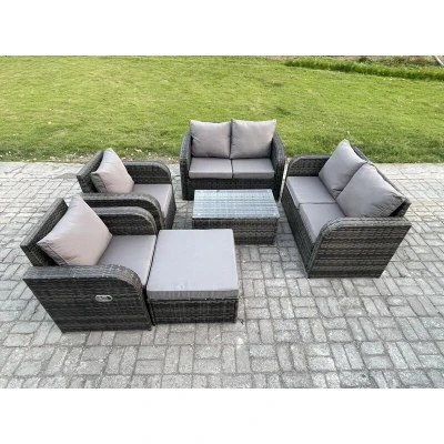 Rattan Garden Furniture Set Patio Outdoor Lounge Sofa with 2 Reclining Chairs Rectangular Coffee Table Big Footstool Dark Grey Mixed Fimous