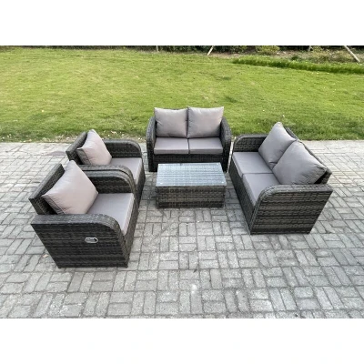 General description This classic Fimous Rattan Garden Furniture Set is designed for outdoor lounging and can accommodate up to 6 people. It features a comfortable and soft cushion back, crafted from premium dark grey rattan that is durable enough to withstand British weather. Technical specifications 2 x Reclining Chairs: 74L x 67W x 79H cm 2 x Love Sofa: 124W x 67D x 79H cm 1 x Oblong Coffee Table: 85L x 50W x 37H cm Seat Cushion Thickness: 8 cm Material: Dark grey mixed rattan with dark grey fabric Glass Tabletop: 5mm thickness transparent tempered glass Installation Items come flat packed and are easy to assemble. Sturdy galvanized steel tube metal frames with powder coating to prevent rust. Usage The armchairs are adjustable, allowing you to change the back inclination from 90° to 130°. For longevity, keep the cushions indoors or use a rain cover when not in use. Use a rain cover if the furniture is not used for an extended period. Other information For any issues with assembly,
