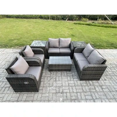 General description This classic rattan garden furniture set is designed to accommodate up to 6 people, featuring a comfortable and soft cushion back. Made from premium dark grey rattan, it is built to withstand various weather conditions. The set includes two reclining chairs, a rectangular coffee table, and two side tables, making it perfect for outdoor lounging. Technical specifications Set Dimensions: 2 x Side Coffee Tables: 65L x 65W x 66H cm 2 x Reclining Chairs: 74L x 67W x 79H cm 2 x Love Sofas: 124W x 67D x 79H cm 1 x Oblong Coffee Table: 85L x 50W x 37H cm Material: Dark grey mixed rattan with dark grey fabric Cushion Thickness: 8 cm Installation Items come flat packed and are easy to assemble. Includes sturdy galvanized steel tube metal frames with powder coating to prevent rust. 5mm thickness transparent tempered glass with suckers on the surface to prevent sliding. Usage The reclining chairs can be adjusted from 90° to 130° using a button. Removable cushion covers for
