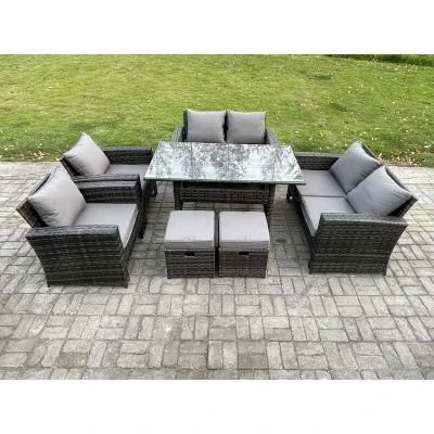 Rattan Garden Furniture Set Patio Outdoor Lounge Sofa with Oblong Dining Table Double Seat 2 Small Footstools Dark Grey Mixed Fimous