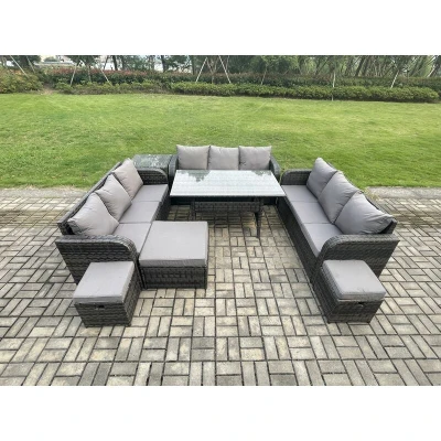 Rattan Garden Furniture Set with Oblong Rectangular Dining Table 3 Footstools Side 11 Seater Outdoor Lounge Sofa Dark Grey Mixed Fimous