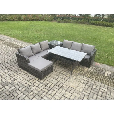 Rattan Garden Furniture Set with Oblong Rectangular Dining Table Big Footstool Side 5 Pieces Outdoor Lounge Sofa Dark Grey Mixed Fimous
