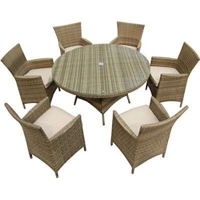 Rattan Garden Furniture Table and Chairs Sets, 7 Pieces Patio Outdoor Round Dining Sets ALUMINUM FRAME RUST FREE FULLY ASSEMBLED Nature 135cm with 6 Seater